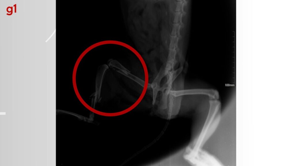 Raio-x mostra fraturas do gato após levar um tiro na perna