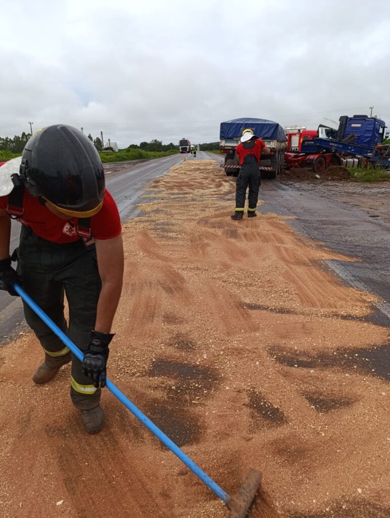 Os bombeiros também atuaram na limpeza da pista e utilizaram serragem para absorver o óleo derramado.
