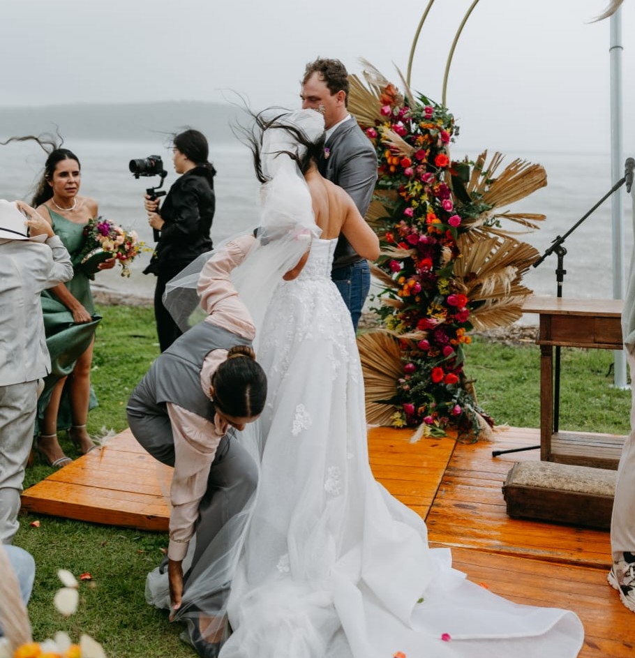 “Havíamos marcado para começar a cerimônia às 4h30 da tarde, mas teve alguns atrasos dos convidados que tivemos que esperar e isso o tempo já estava fechando. Deu tempo apenas de entrar até o altar, porque até o chapéu do Eduardo [noivo] quase foi parar no lago com o vento”, relembrou a noiva.