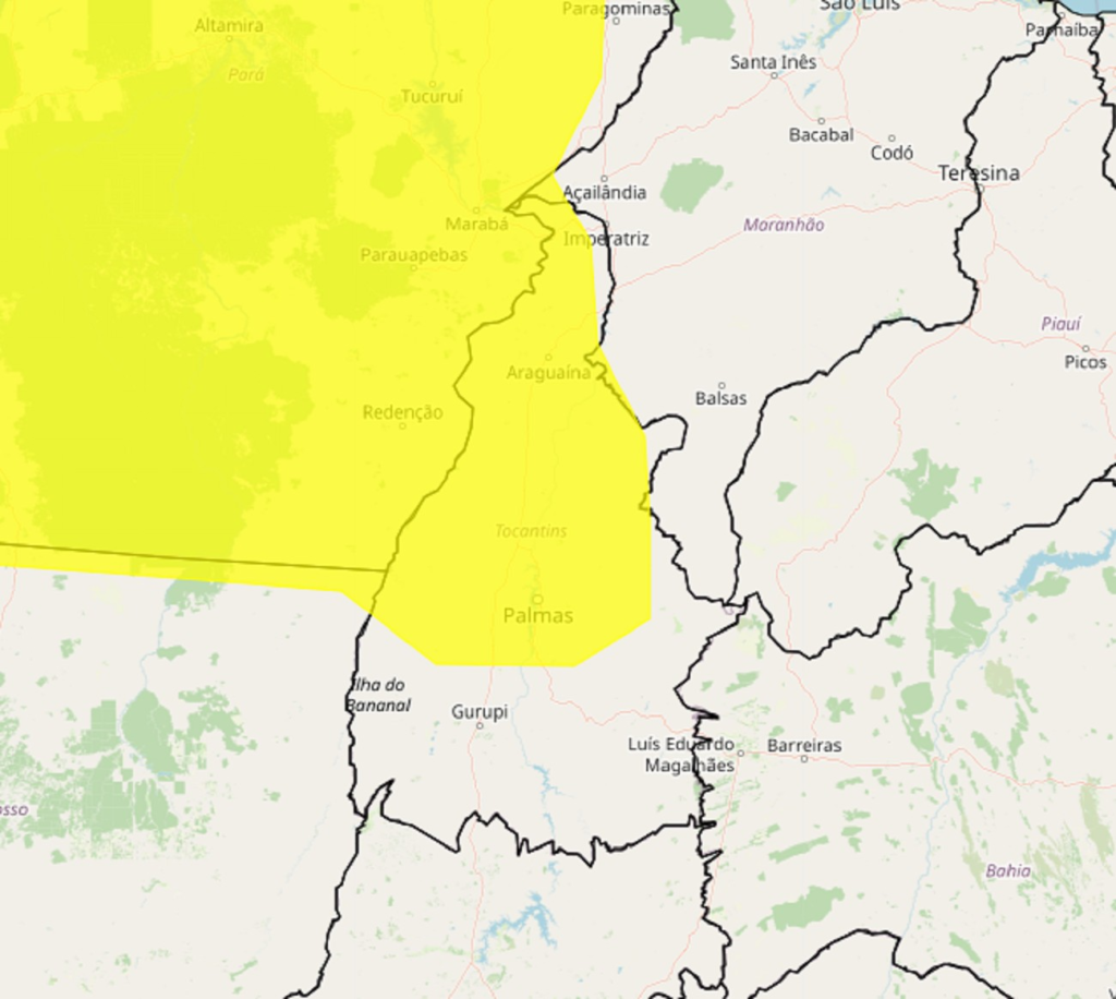 O Instituto Nacional de Meteorologia (Inmet) emitiu um alerta amarelo de chuvas intensas para grande parte do Tocantins, incluindo as regiões central, norte e Bico do Papagaio. O aviso começou nesta quarta-feira (8) e termina na quinta-feira (9), às 9h. A previsão é de chuvas com 20 a 30 milímetros por hora.